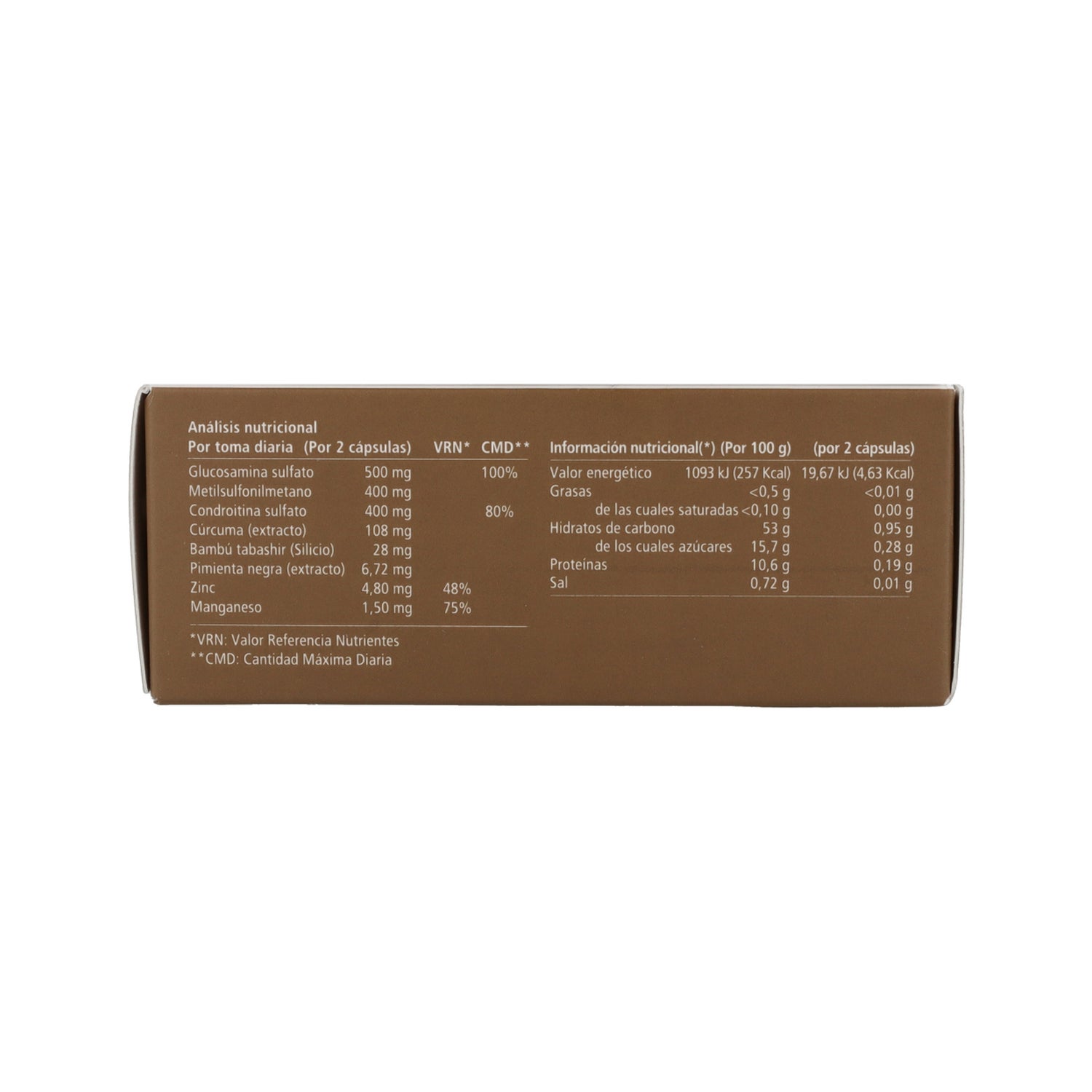 Élaboré à base de sulfate de glucosamine, sulfate de chondroïtine, MSM, bambou, curcuma, extrait de poivre noir, manganèse et zinc.