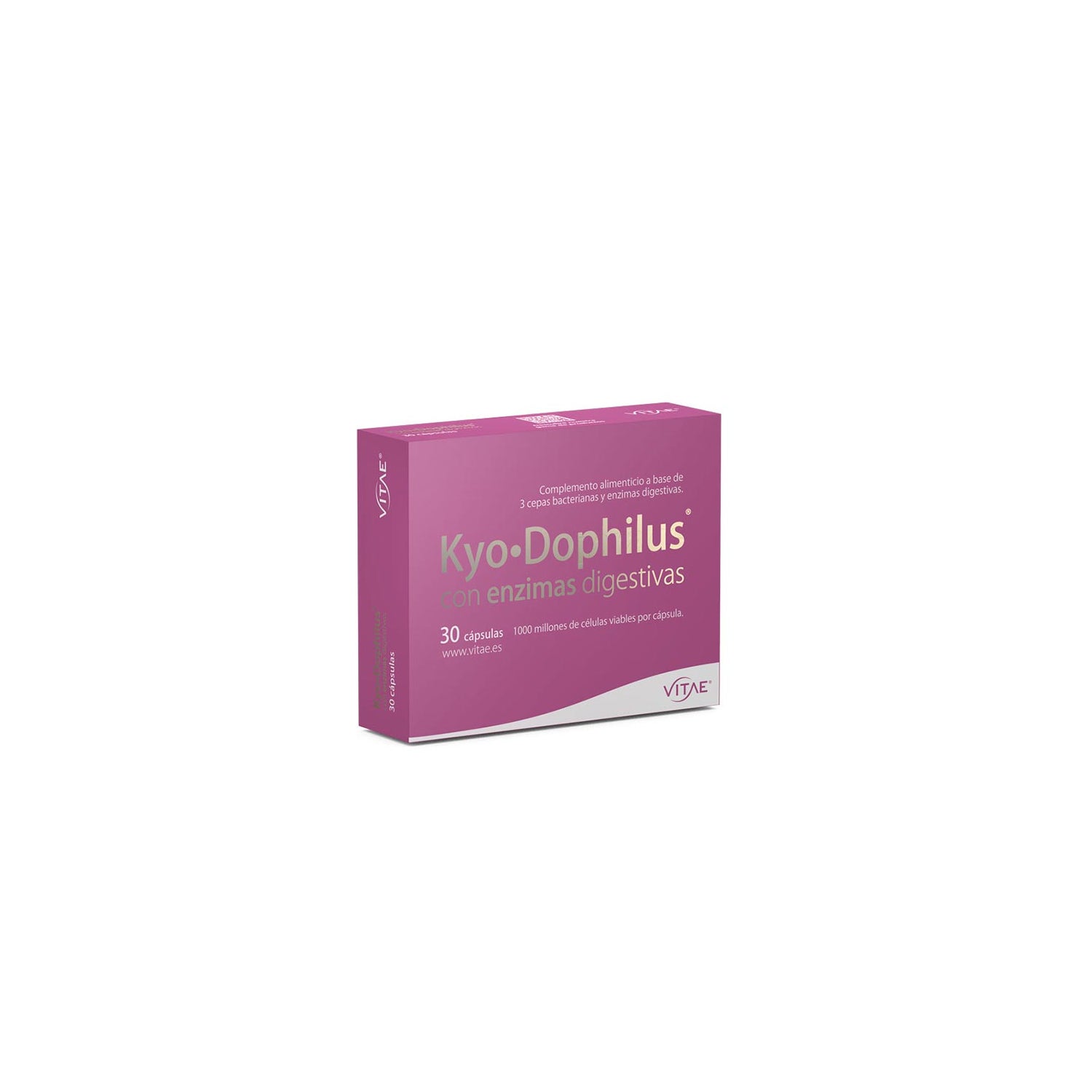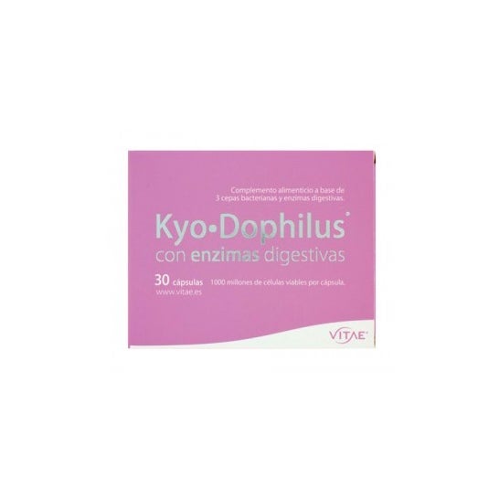 Vitae Kyo Dophilus with Digestive Enzymes 30caps est un complément alimentaire pour adultes qui associe trois souches bactériennes présentes dans l'intestin humain(Lactobacillus gasseri, Bifidobacterium bifidum et Bifidobacterium longum) à quatre enzymes digestives(lipase, lactase, protéase et amylase) exerçant un effet probiotique sur l'organisme.