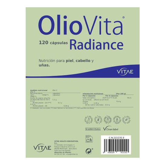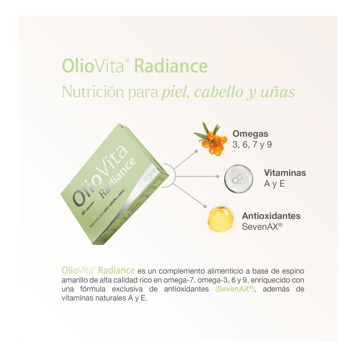 OlioVita Radiance est un supplément antioxydant naturel formulé avec de l'huile de baies de l'épine vinette riche en oméga 7, 3, 6 et 9 et le complexe exclusif SevenAX®. Il nourrit de l'intérieur pour améliorer l'hydratation, l'élasticité et la luminosité de la peau, tout en renforçant les cheveux et les ongles.