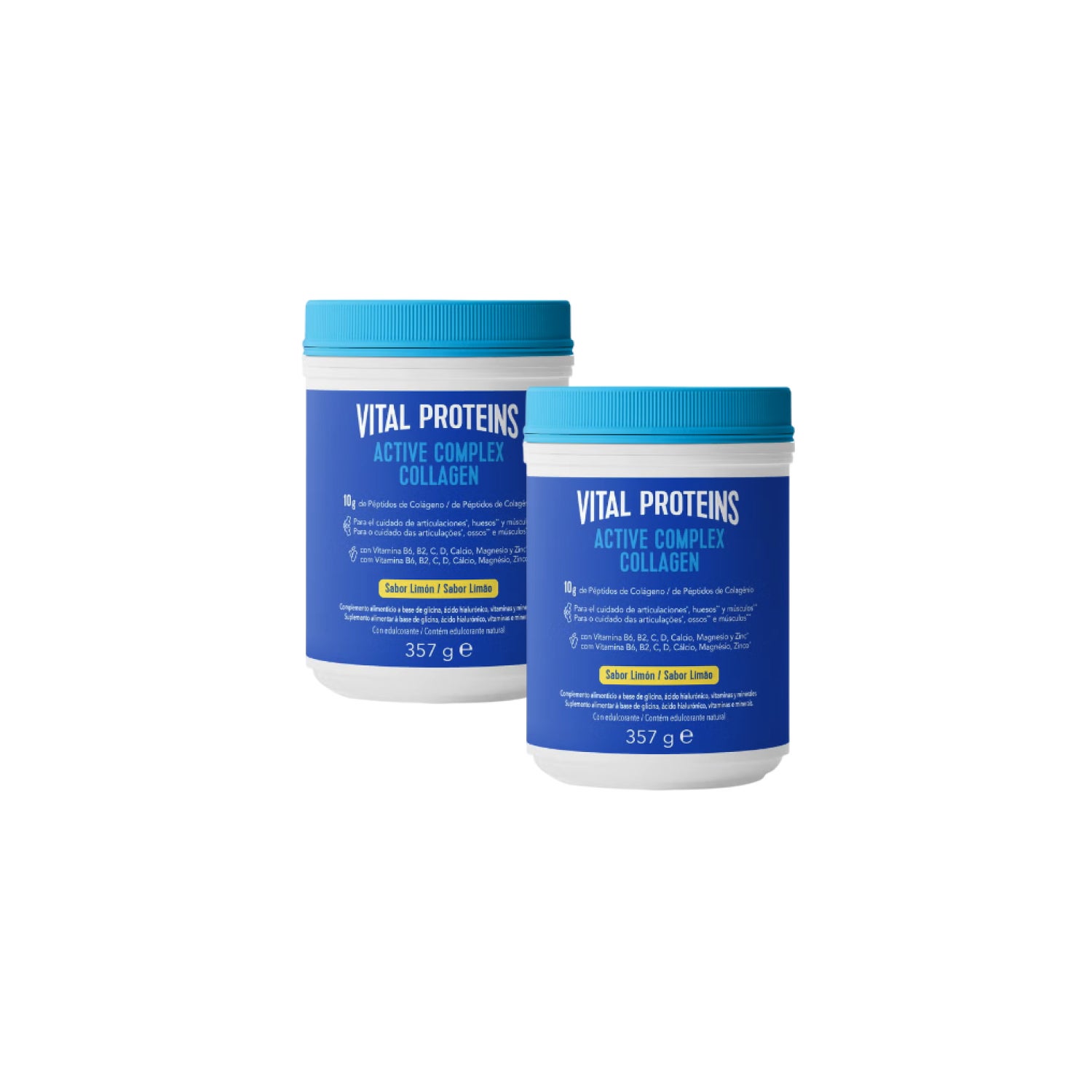 Vital Proteins Pack Active Complex Collagène Citron 2x357g est composé de peptides de collagène, calcium, magnésium, zinc, riboflavine, vitamine B6, C, D, acide hyaluronique et glycine.