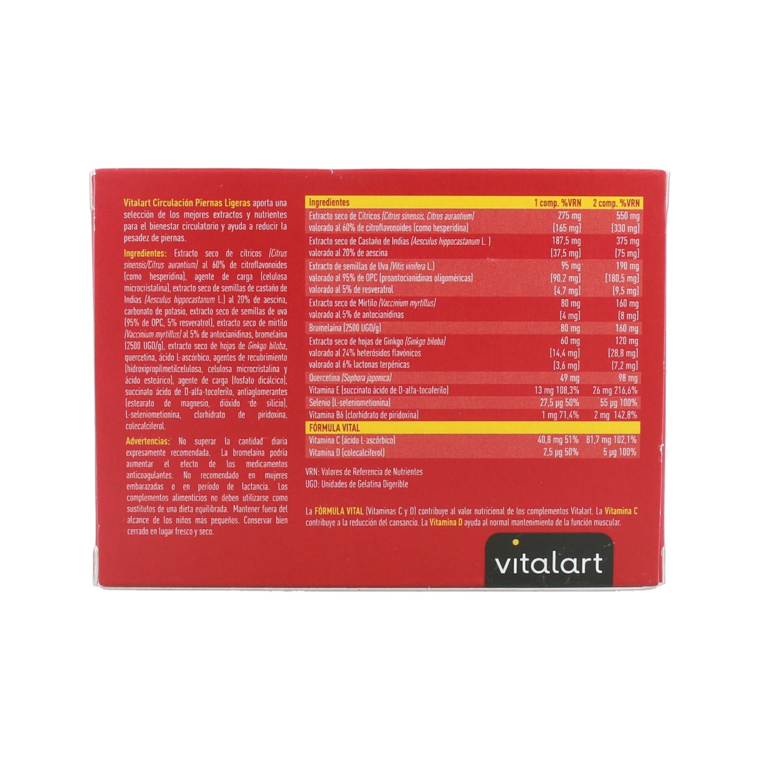 Ingrédients pour 1 comprimé : Extrait sec d'agrumes (Citrus sinensis, Citrus aurantium), évalué à 60% de citroflavonoïdes (sous forme d'hespéridine) 275 mg, Extrait sec de marron d'Inde (Aesculus hippocastanum L) évalué à 20% d'aescine 187,5 mg, Extrait de pépins de raisin (Vitis vinifera L.), évalué à 20% d'aescine 187,5 mg.), 95% OPC (oligomères proanthocyanidines), 5% resvératrol 95 mg, Extrait sec de myrtille (Vaccinium myrtillus), 5% anthocyanidines 80 mg, Bromélaïne (2500 UGD/g) 80 mg, Extrait sec de feuilles de ginkgo (Ginkgo biloba), 24% hétérosides, 6% lactones terpéniques 60 mg, Quercétine (extrait de Sophora japonica) 49 mg, Vitamine E (succinate d'acide D-alpha-tocophéryl) 13 mg 108,3% VNR, Sélénium (L-sélénométhionine) 27,5 mcg 50% VNR, Vitamine B6 (chlorhydrate de pyridoxine) 1 mg 71,4%RVP, Formule Vitale (Vitamine C (acide L-ascorbique) 40,8 mg 51%RVP, Vitamine D (cholécalciférol) 2,5 mcg 50%RVP. VNR : Valeurs nutritionnelles de référence. UGD : Unités de gélatine digestible.