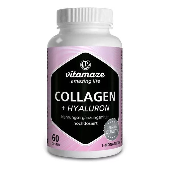 Vitamaze Collagène 300mg + Acide Hyaluronique 60 Capsules est un complément alimentaire à base de collagène, d'acide hyaluronique, de chondroïtine et de lysine qui contribue au maintien normal des os et de la peau.