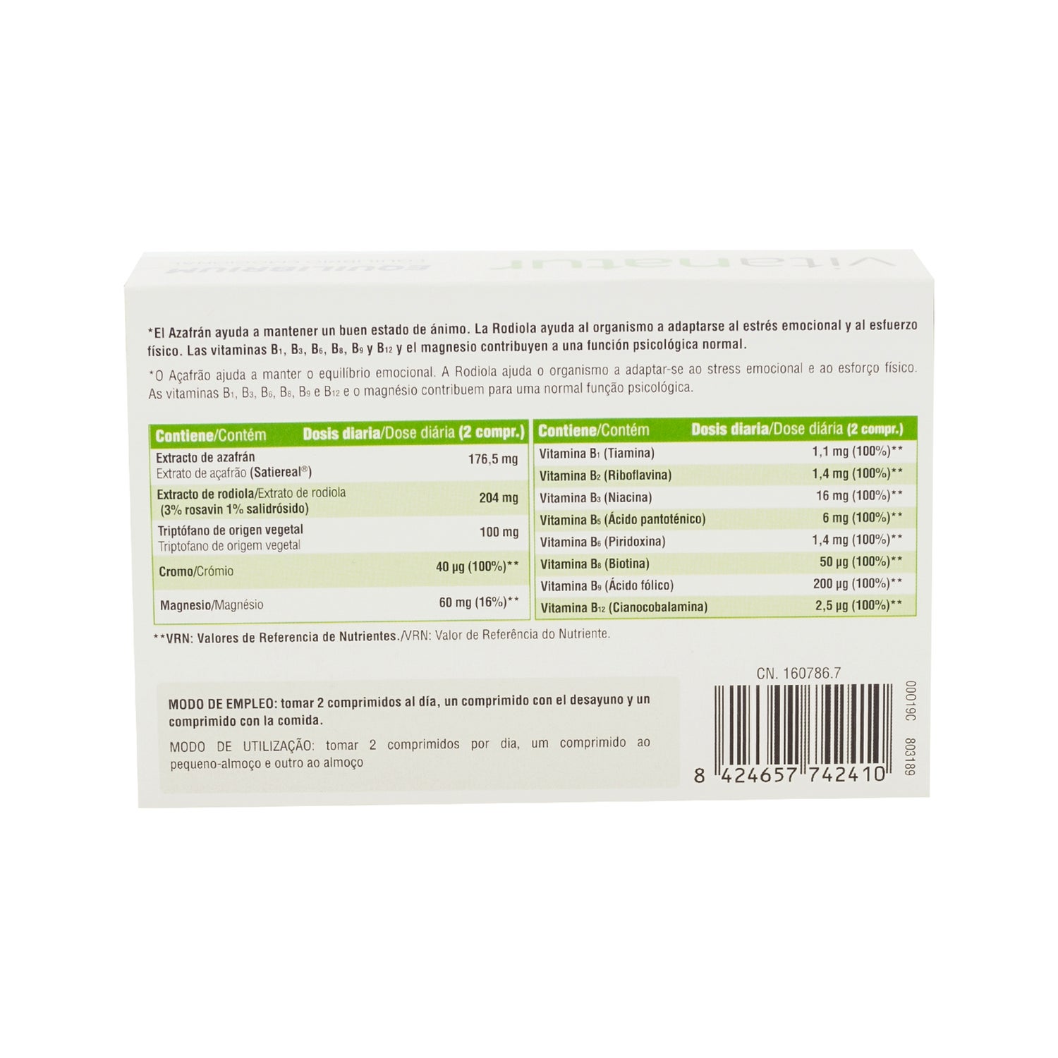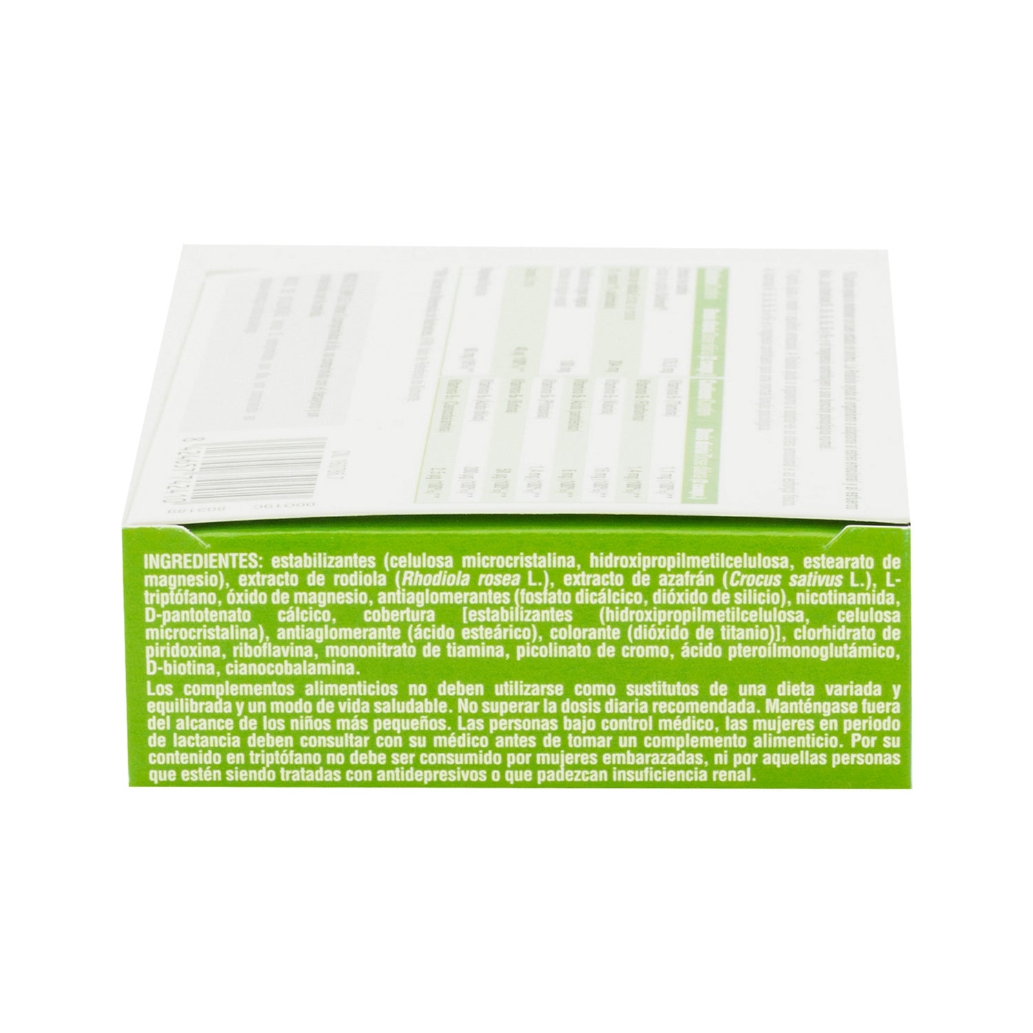 EXTRAIT DE SAFRAN, EXTRAIT DE RHODIOLA, TRYPTOPHANE, CHROME, MAGNÉSIUM, VITAMINE B1 (THIAMINE), VITAMINE B2 (RIBOFLAVINE), VITAMINE B3 (NIACINE), VITAMINE B5 (ACIDE PANTOTHÉNIQUE), VITAMINE B6 (PYRIDOXINE), VITAMINE B8 (BIOTINE), VITAMINE B9 (ACIDE FOLIQUE), VITAMINE B12 (CYANOCOBALAMINE).