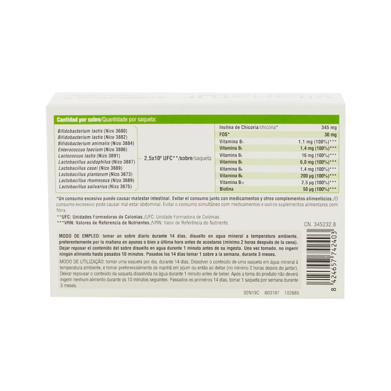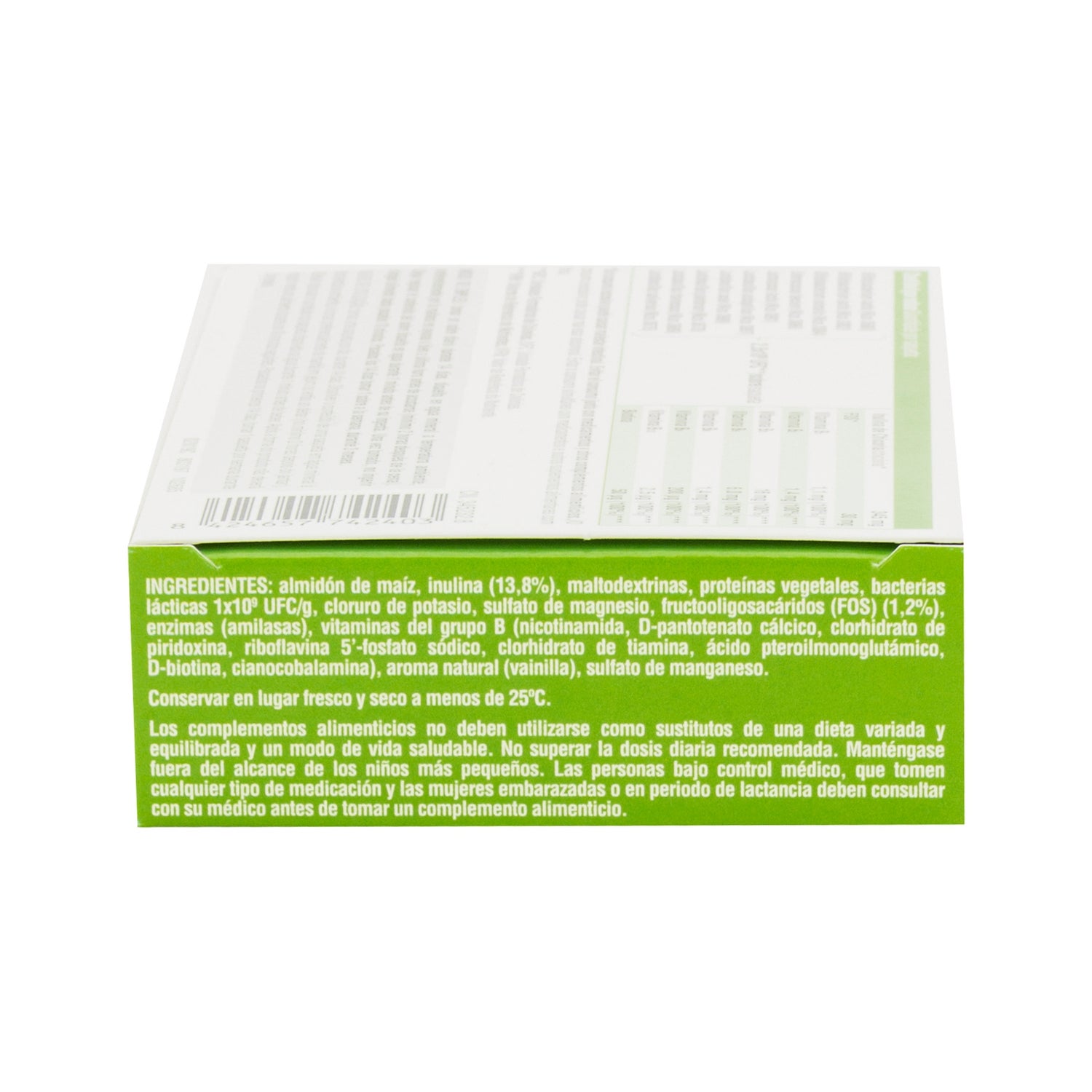Amidon de maïs, inuline (13,8%), maltodextrines, protéines végétales, bactéries lactiques 1 × 109 CFU / g, chlorure de potassium, sulfate de magnésium, fructooligosaccharides (FOS) (1. 2%), enzymes (amylases), vitamines B (Nicotinamide (Niacine), D-Pantothénate de calcium (Acide pantothénique), Chlorhydrate de pyridoxine (Vitamine B6), Riboflavine 5'-phosphate de sodium (Roboflavine), Chlorhydrate de Thiamine (Thiamine), Acide Ptéroylmonoglutamique (Acide folique), D-Biotine (Biotine), Cyanocobalamine (Vitamine B12)), Sulfate de Manganèse (Manganèse).