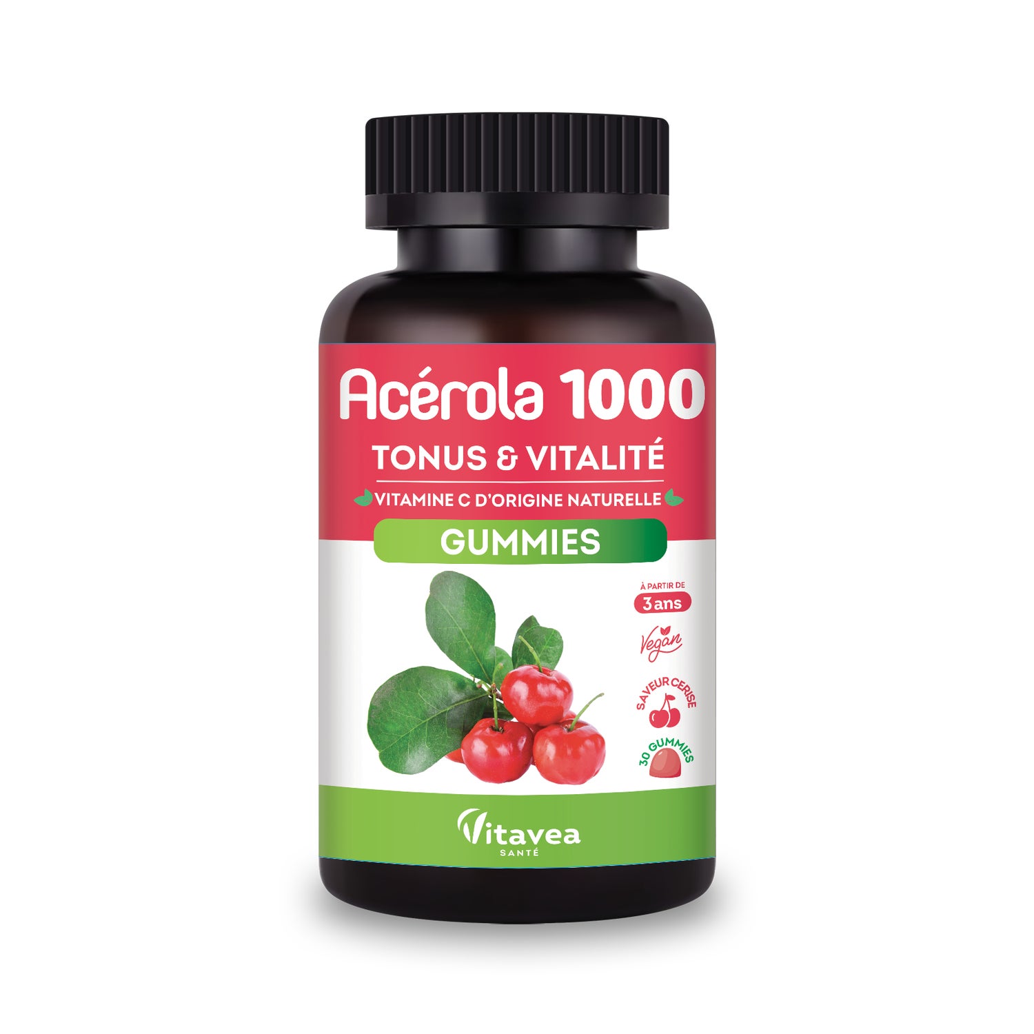 Complément alimentaire à base d'extrait concentré de jus d'acérola en poudre, source naturelle de vitamine C. Aide à prévenir les sensations de fatigue ou de lassitude et à renforcer le système immunitaire. Aide à stimuler la production et la synthèse naturelles de collagène. Se présente sous la forme d'une capsule à mâcher très pratique, au goût agréable de cerise. Convient aux végétaliens. Avec des ingrédients certifiés biologiques. Fabriqué en France.