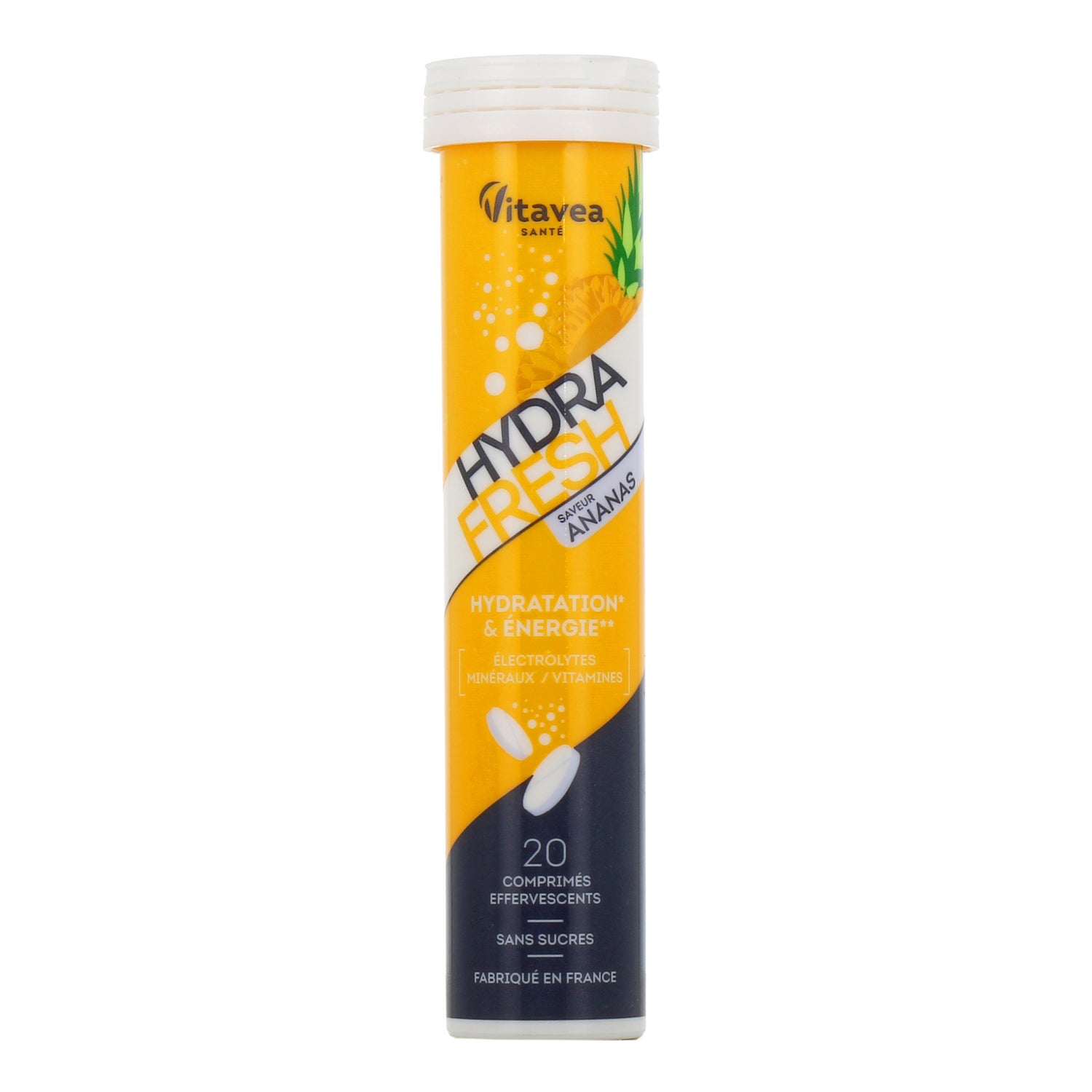 Vitavea Hydrafresh Hydratation & Énergie Ananas est une solution isotoniques conçue pour optimiser l'hydratation et fournir de l'énergie à tout moment de la journée. Ce complément alimentaire se présente dans un format pratique et attrayant, idéal pour diverses situations.