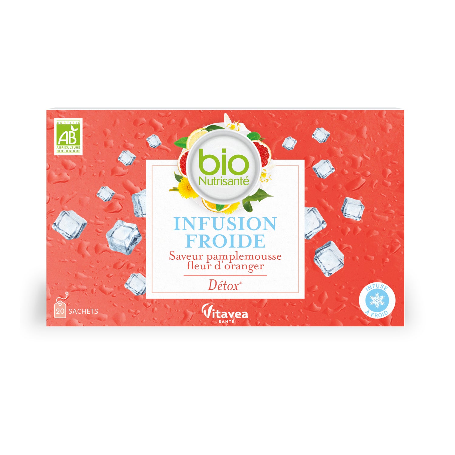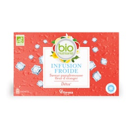 Cette infusion froide bio de Vitavea Santé allie les bienfaits des plantes à une saveur rafraîchissante mêlant pamplemousse et fleur d’oranger. À base de: