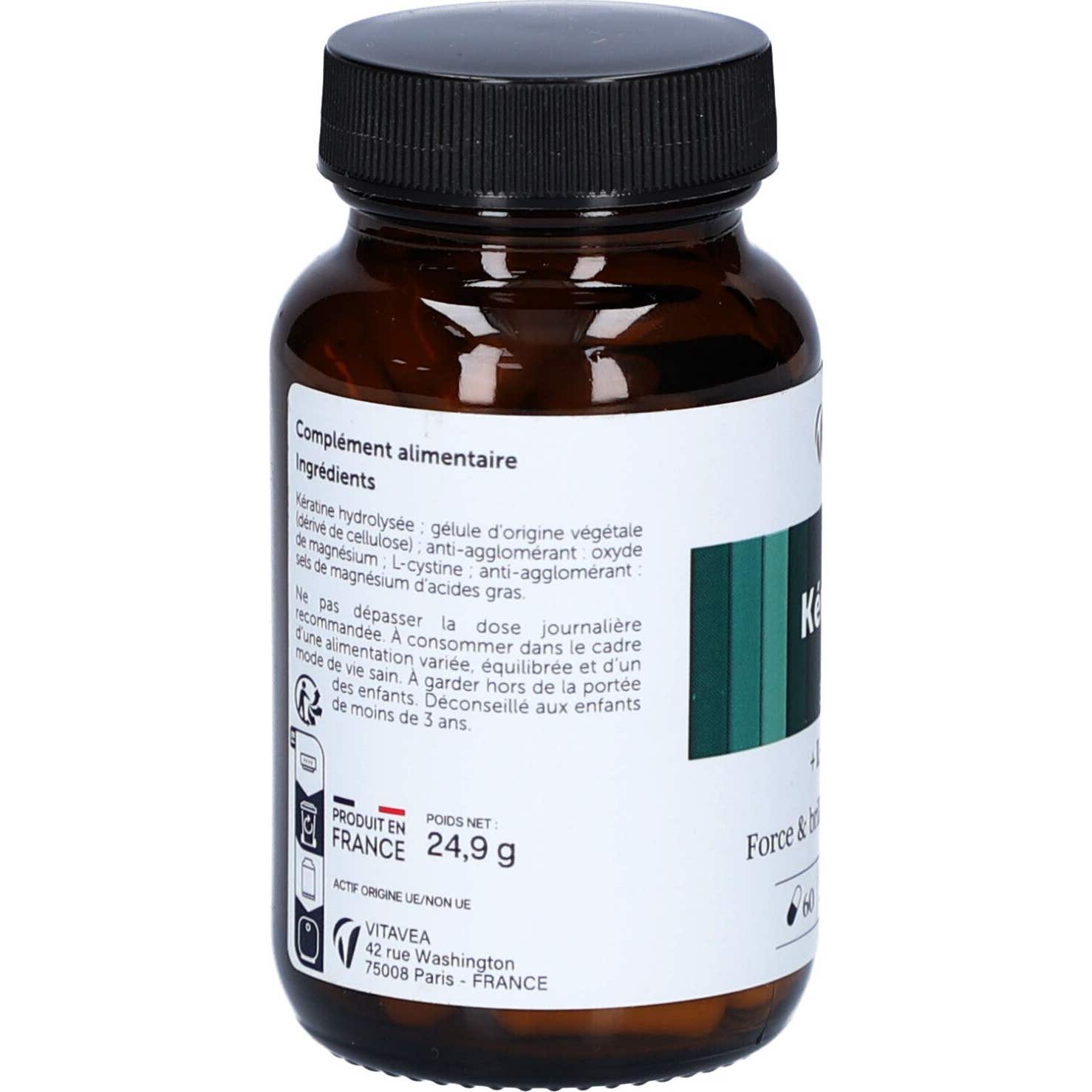 Ce produit est composé de kératine hydrolysée, ce qui facilite son absorption, et se présente sous forme de capsules d'origine végétale, dérivées de cellulose. De plus, il inclut des agents anti-agglomérants tels que :