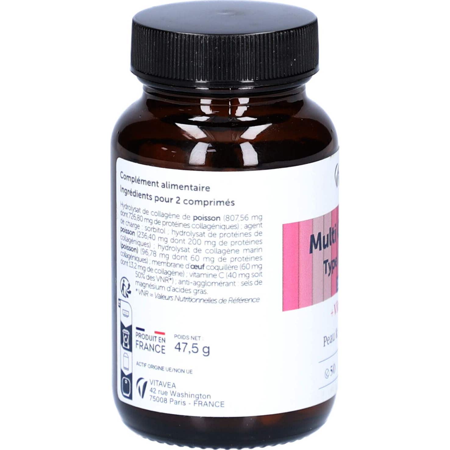 Vitavea Multi Collagène Type I II III V X est un complément alimentaire qui offre une combinaison de cinq types de collagène, permettant une action intégrale sur divers tissus de l'organisme. Ce produit est conçu pour contribuer au bien-être de la peau, des tendons, du cartilage et des muscles.