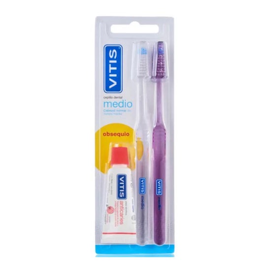 Vitis Brosses À Dents Medium 2 Unités + Dentifrice Anti-Caries 15ml comprend deux brosses à dents et un dentifrice anti-caries pour une hygiène bucco-dentaire optimale.