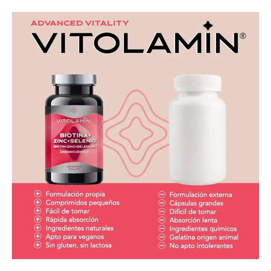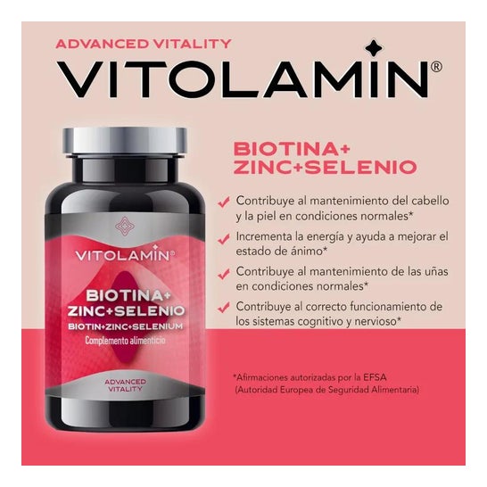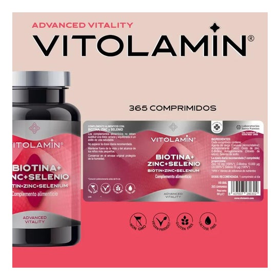 Vitolamin Biotin + Zin + Selenium 365comp est un complément alimentaire contenant de la biotine, du zinc et du sélénium.