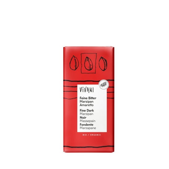 Massepain à l'amaretto et chocolat noir biologique Vivani. Une délicieuse combinaison faite exclusivement de miel et d'amandes biologiques et agrémentée de véritable amaretto, elle fond avec l'enrobage de chocolat noir (60% de cacao). Sans plastique et certifié Rainforest.