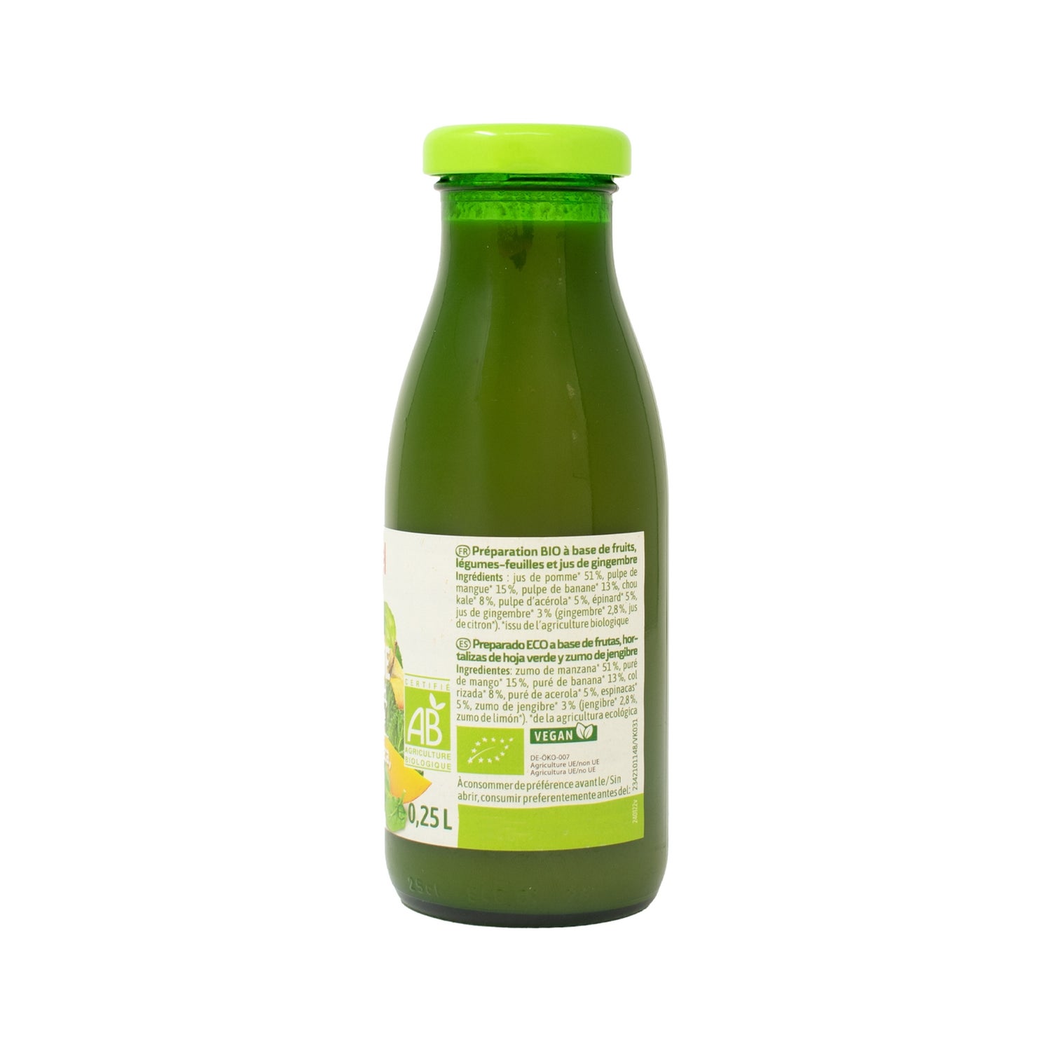 Délicieux et sain smoothie vert, composé de mangue, de gingembre, de chou frisé et d'épinards, issus de cultures biologiques de qualité certifiée Demeter®, qui procure de multiples bienfaits à l'organisme.