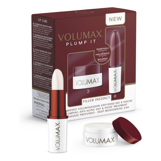 Volumax Pack Plump It Filler Instinct Stick Jour + Baume Nuit traitement volumateur des lèvres combine un stick de jour et un baume de nuit pour apporter volume naturel, fermeté et une hydratation profonde pendant 24 heures. Il est conçu pour rehausser le contour et adoucir les rides péribuccales, avec un effet repulpant immédiat et progressif.