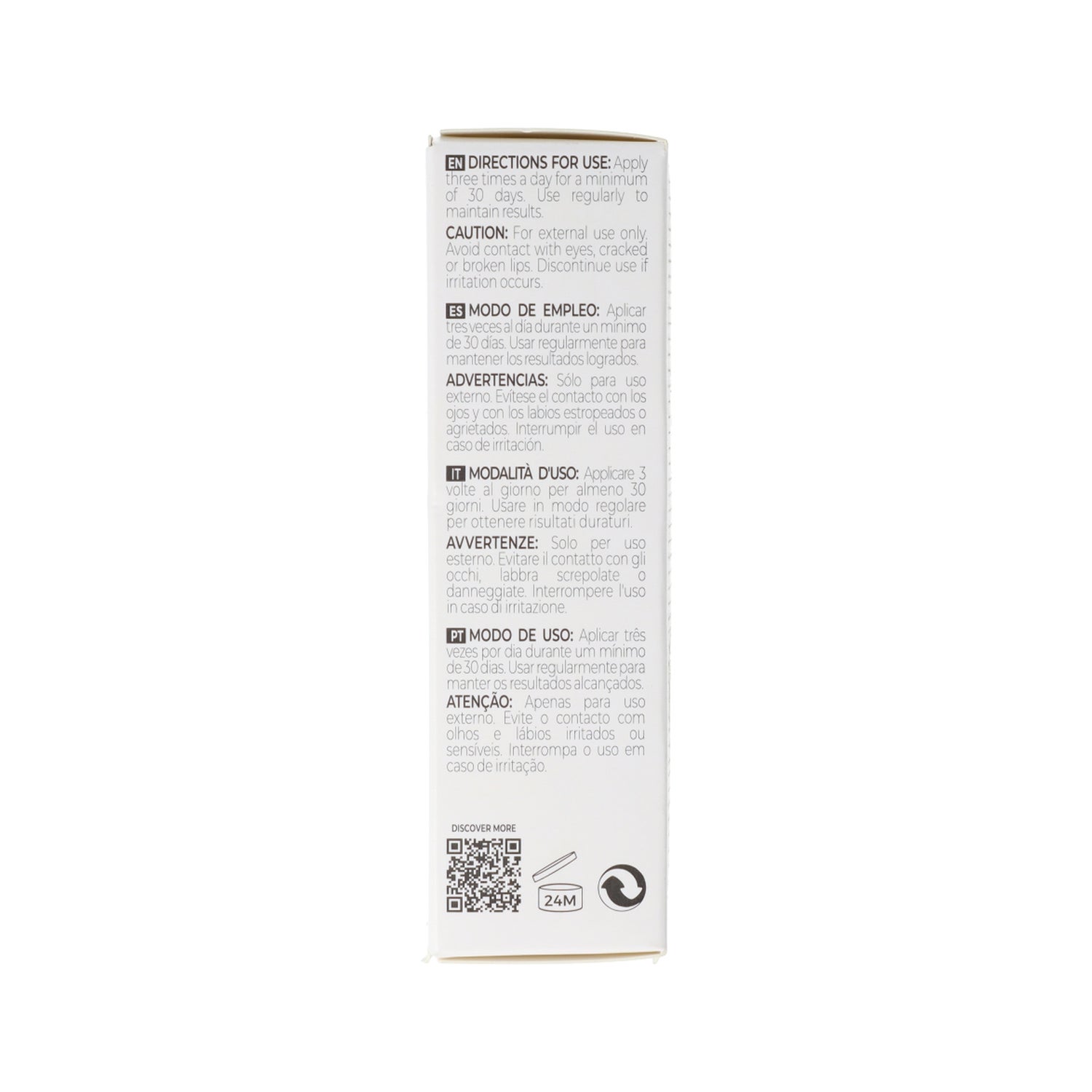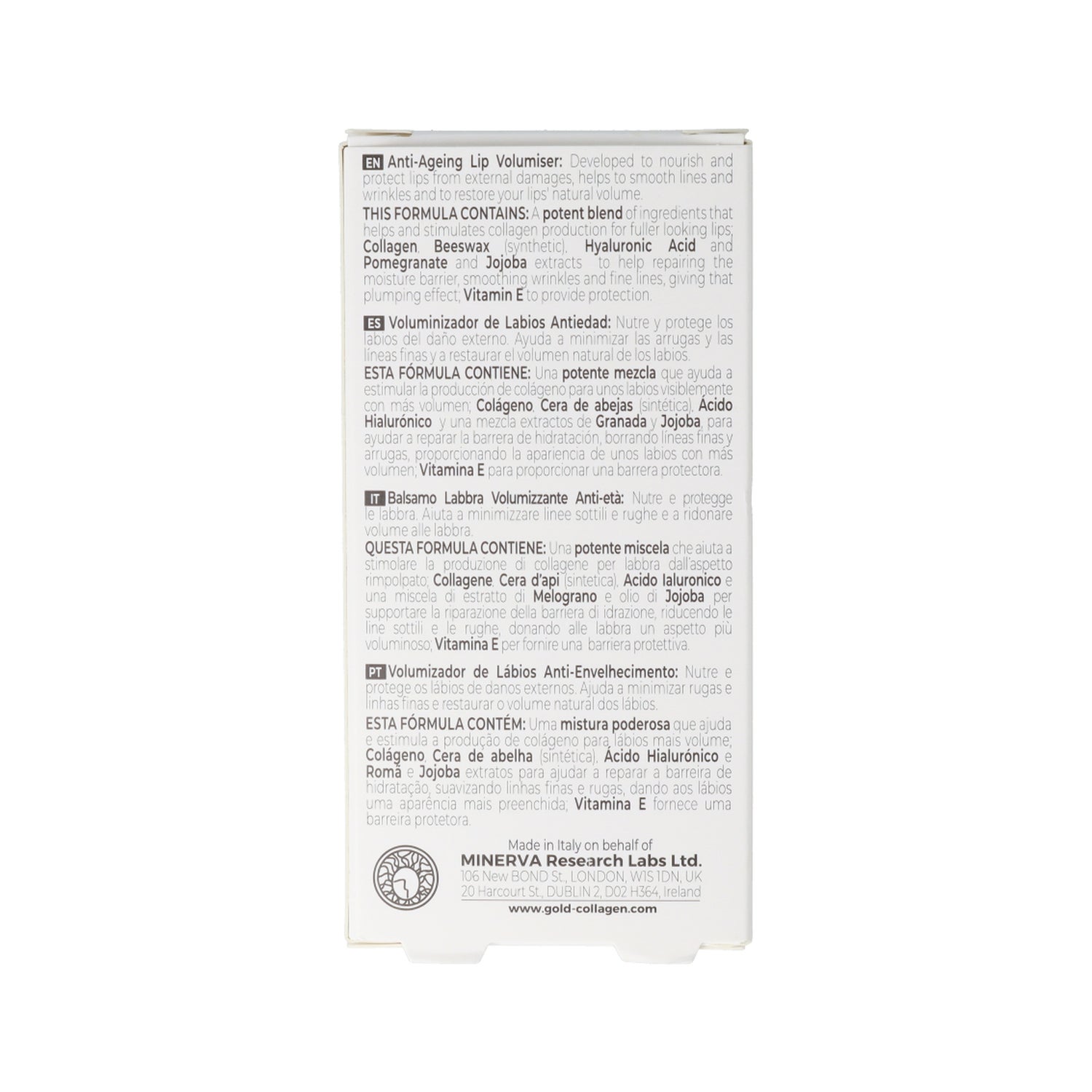 Rouge à lèvres volumisant. Sa formule a été conçue avec un puissant mélange d'oligopéptides qui aident à obtenir une apparence de plus de volume aux lèvres, améliorant leur aspect et aidant à lisser les lignes d'expression et les rides.