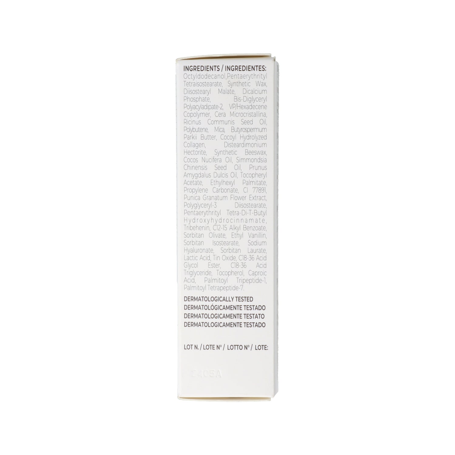 HUILE (VÉGÉTALE), PARAFFINUM LIQUIDUM (HUILE MINÉRALE), CIRE SYNTHÉTIQUE, HUILE DE COCO HYDROGÉNÉE, HUILE DE GRAINES DE RICIN (CASTOR), PALMITATE DE CÉTYLE, BEURRE DE BUTYROSPERMUM PARKII (KARITÉ), HUILE D'AMANDE DOUCE (PRUNUS AMYGDALUS DULCIS), MÉTHOXYCINNAMATE D'ÉTHYLHEXYLE, CIRE MICROCRISTALLINE HYDROGÉNÉE, PALMITATE D'ÉTHYLHEXYLE, MICA, AQUA (EAU), UNDÉCYLÉNATE DE GLYCÉRYLE, POUDRE DE NACRE, DIOXYDE DE TITANE, PARFUM (FRAGRANCE), TRIBEHENIN, ACIDE STÉARIQUE, ACÉTATE DE TOCOPHÉRYLE, ISOSTÉARATE DE SORBITAN, PROPYLÈNE GLYCOL, BENZOATE DE BENZYLE, ACIDE LACTIQUE, COUMARINE, CINNAMATE DE BENZYLE, COLLAGÈNE DE POISSON, BHT, PALMITOYL OLIGOPEPTIDE.*CONTIENT DE L'HUILE D'AMANDE, DE LA CIRE D'ABEILLE ET DU COLLAGÈNE DE POISSON.