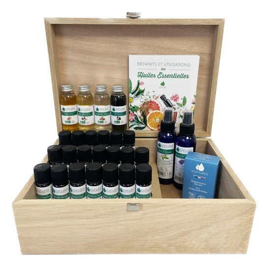 La boîte a été élaborée avec des matériaux de haute qualité, fournissant une protection efficace contre la lumière et les chocs, ce qui contribue à la conservation des huiles essentielles. De plus, le kit inclut un livre intitulé "Bienfaits et utilisations des huiles essentielles", qui offre des informations précieuses sur les propriétés des huiles essentielles, ainsi que des recettes pour leur utilisation.