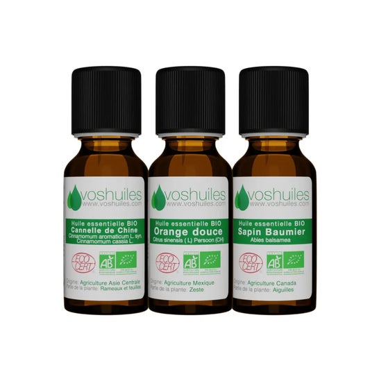 Voshuiles Kit Les 3 Huiles Essentielles Arômes de Noël Bio est une sélection conçue pour créer une atmosphère festive à la maison pendant la saison des fêtes. Ce kit comprend trois huiles essentielles de haute qualité :