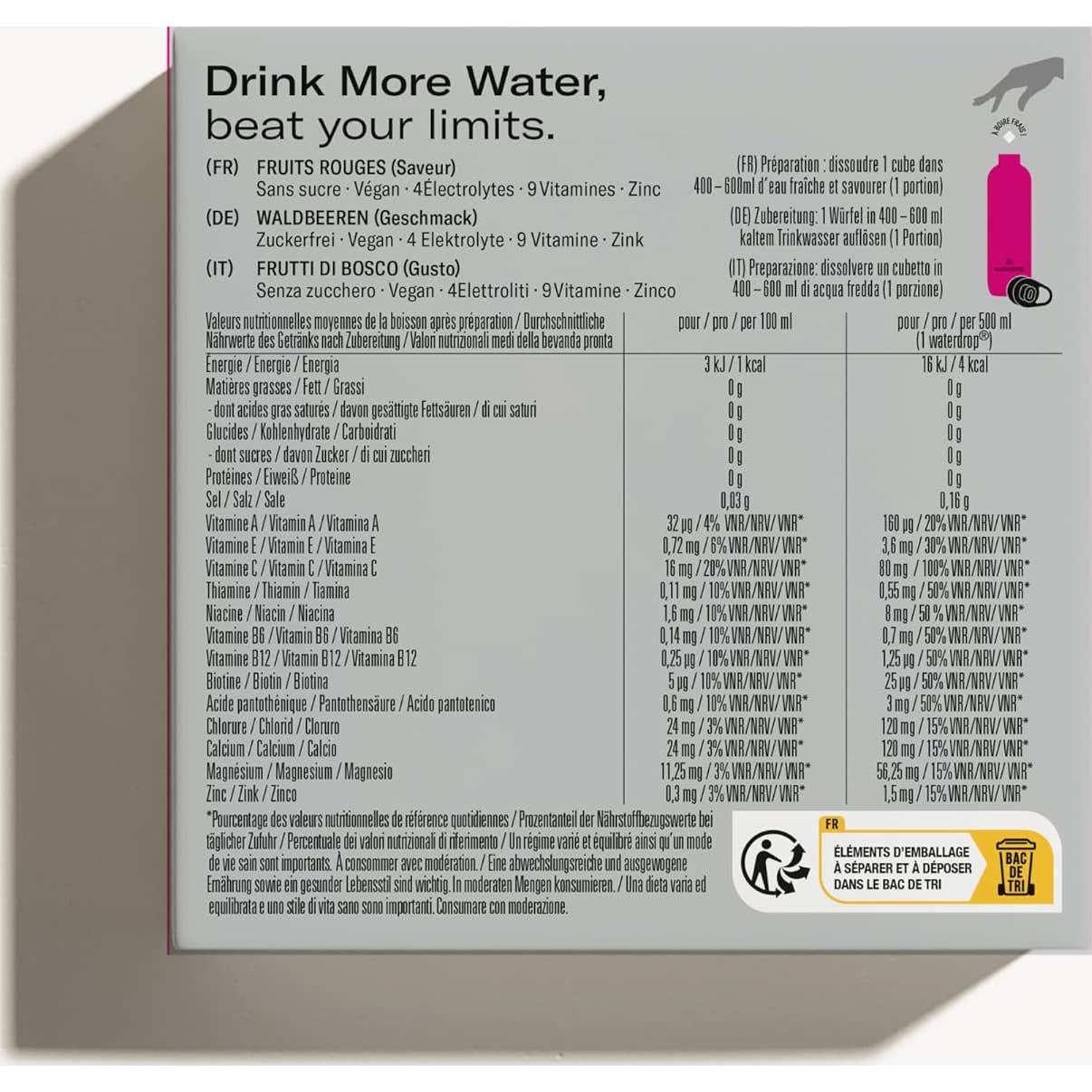 Waterdrop Microlyte Baies 12x2.2 gr est un produit conçu pour fournir des électrolytes essentiels, tels que le sodium, le calcium, le magnésium et le chlorure, pendant les activités sportives, sans compromettre le goût.