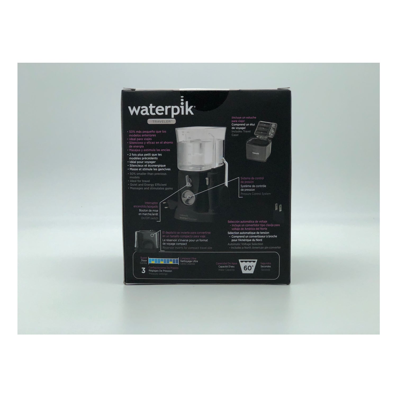 Waterpik Traveler WP-300 est un hydropulseur électrique de voyage qui peut être emporté partout grâce à sa taille jusqu'à 50 % plus petite que celle des hydropulseurs traditionnels.