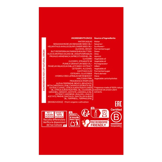 Water (Aqua), Sesamum Indicum (Sesame) Seed Oil+Helianthus Annuus (Sunflower) Seed Oil+ Alcohol denat. Butyrospermum Parkii (Shea) Butter+Olea Europaea (Olive) Oil Unsaponifiables Prunus Armeniaca (Apricot) Kernel Oil, Glycerin, Glyceryl Stearate SE, Punica Granatum Seed Oil+,Panicum Miliaceum (Millet) Seed+ Extract, Cetearyl Alcohol, Xanthan Gum, Cetearyl Glucoside, Hydrolyzed Lepidium Meyenii Root, Maltodextrin, Fragrance (Parfum), Alpha-Terpinene, Benzyl Benzoate,Beta-Caryophyllene, Cananga Odorata Oil/Extract, Citral, Citrus Aurantium Flower Oil, Citrus Aurantium Peel Oil, Coumarin, Geraniol, Geranyl Acetate, Lavandula Oil/Extract, Limonene, Linalool, Linalyl Acetate, Pinene, Santalol, Santalum Album Oil, Terpineol, Terpinolene. [8008240002] +from organic cultivation Fragrance made of 100% natural essential oils and/or plant extracts +from organic cultivation