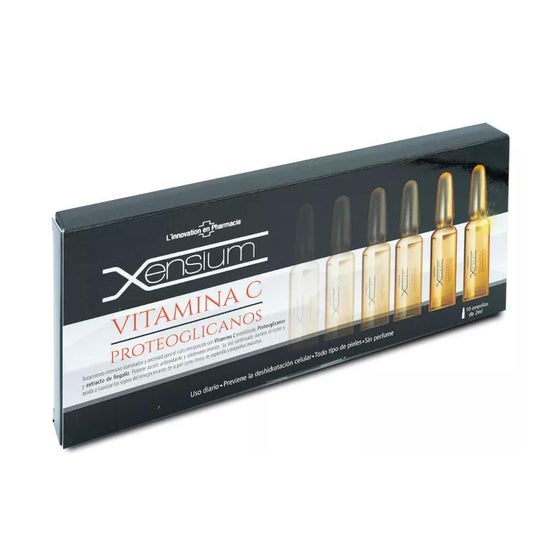 Xensium Protéoglycanes Vitamine C+ 10 Ampoules De 2ml est un soin hydratant et raffermissant à base de vitamine C, de protéoglycanes et d'acide hyaluronique qui apporte hydratation, élasticité et fermeté au visage.