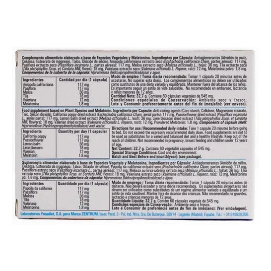 EXTRAIT SEC DE PAVOT CALIFORNIEN 117MG, EXTRAIT SEC DE PASSIFLORE 117MG, EXTRAIT SEC DE MÉLISSE 36MG, EXTRAIT SEC DE CITRONNELLE 18MG, EXTRAIT SEC DE VALÉRIANE 12MG, MÉLATONINE 1.8MG.