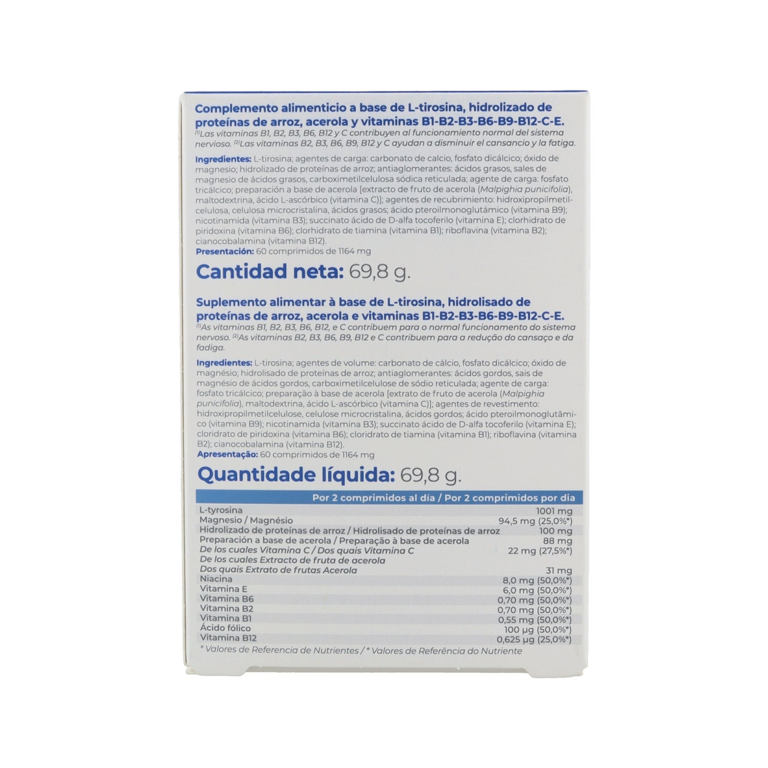 La tyrosine est un acide aminé qui intervient dans la synthèse de certains neurotransmetteurs comme l'adrénaline et la dopamine, impliqués dans l'action, l'excitation et la mémorisation. Il contient toutes les vitamines B, qui contribuent au bon fonctionnement du système nerveux. Ne crée pas de dépendance. Cet acide aminé intervient dans la synthèse de certains neurotransmetteurs tels que l'adrénaline et la dopamine, qui sont impliqués dans l'action, l'éveil et la mémoire. Dynatone contient également toutes les vitamines B, qui contribuent au bon fonctionnement du système nerveux. 60 comprimés.