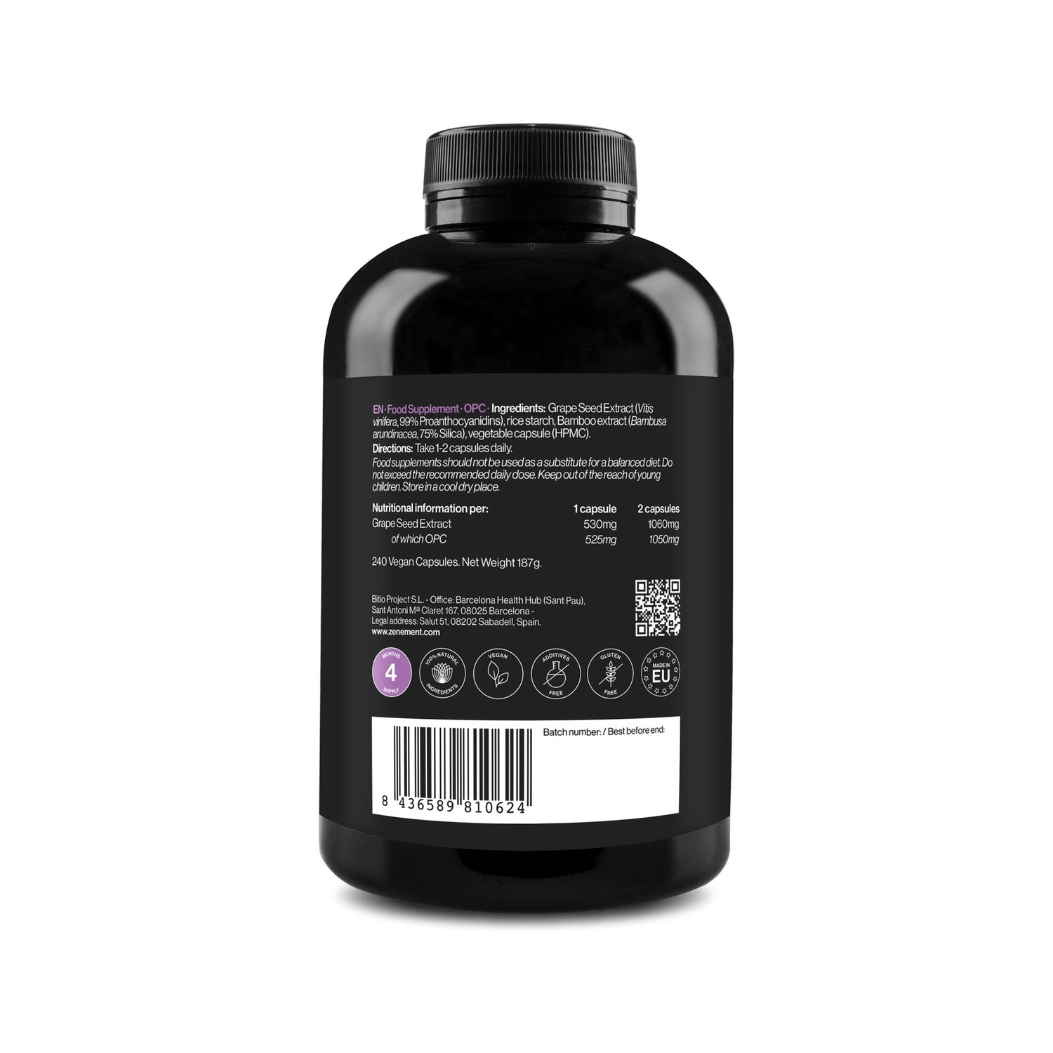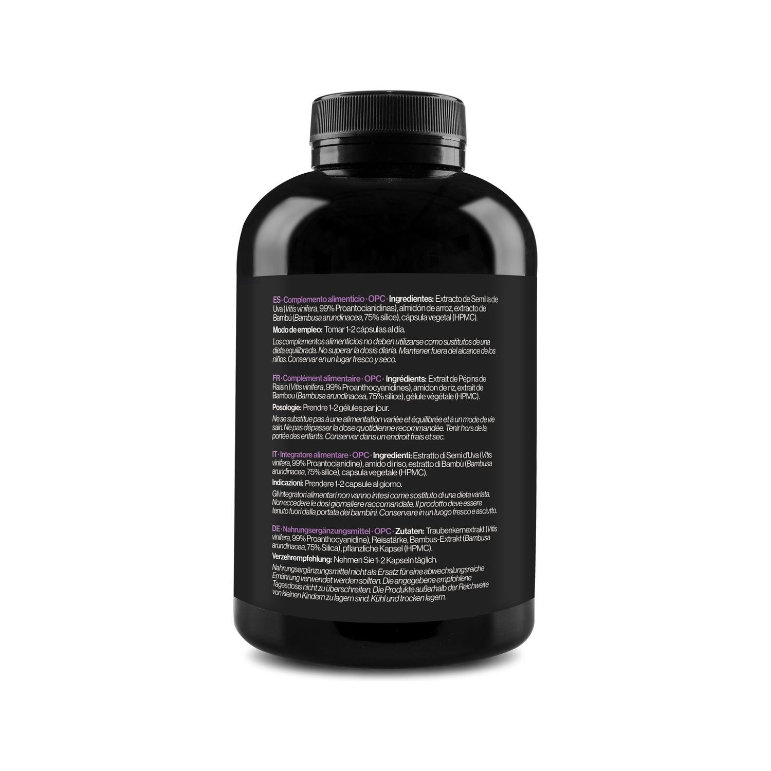 Contrairement à d'autres produits, nos capsules d'OPC proviennent d'extrait de pépins de raisin rouge espagnol. Supplément à haute concentration de 530 mg de pépins de raisin qui fournit 99 % d'OPC, puissant antioxydant offrant de multiples bienfaits pour l'homme et la femme. Les pépins de raisin se distinguent par leur richesse en polyphénols, flavonoïdes et vitamines, parmi lesquels les OPC. Ceux-ci sont connus pour leur effet antioxydant, étant particulièrement efficaces dans le domaine anti-âge, favorisant un vieillissement sain. Notre extrait de pépins de raisin avec un incroyable 99 % d'OPC (proanthocyanidines oligomériques). Avec 1060 mg d'extrait de pépins de raisin espagnol de haute qualité par dose quotidienne, dont 1050 mg d'OPC pur. Cela fait de notre produit le leader du marché en termes de concentration d'OPC. Avec seulement 1 capsule par jour, tu obtiendras 525 mg d'OPC, atteignant un total de 1050 mg par dose (2 capsules).