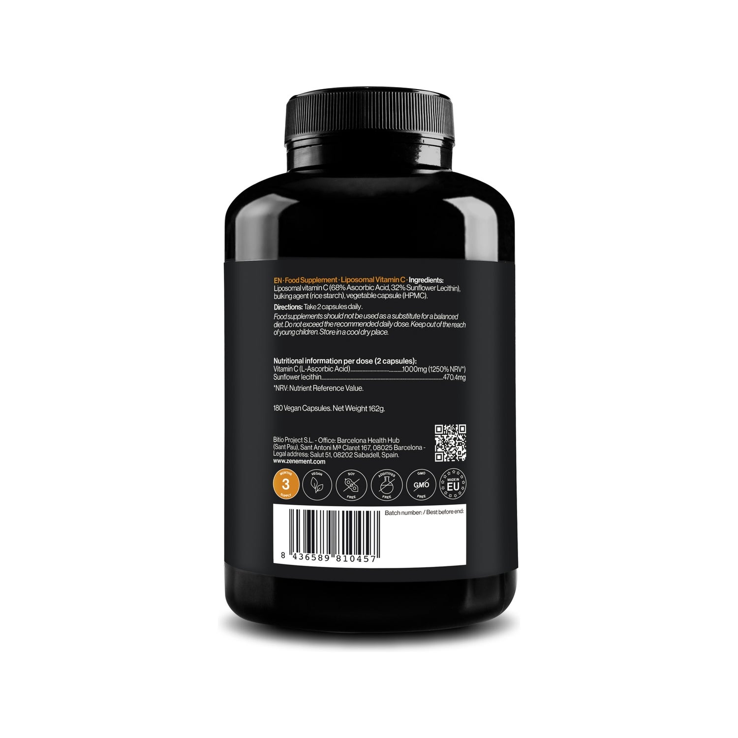 Zenement Vitamine C Liposomale 1000mg 180caps est un complément alimentaire qui aide à maintenir le système immunitaire. Formulé à base de vitamine C liposomale, c'est-à-dire encapsulée dans des liposomes qui aident à l'absorption de la vitamine C par la paroi intestinale. Ce composant aide à l'absorption du fer et est un puissant antioxydant. Indiqué pour renforcer le système immunitaire.