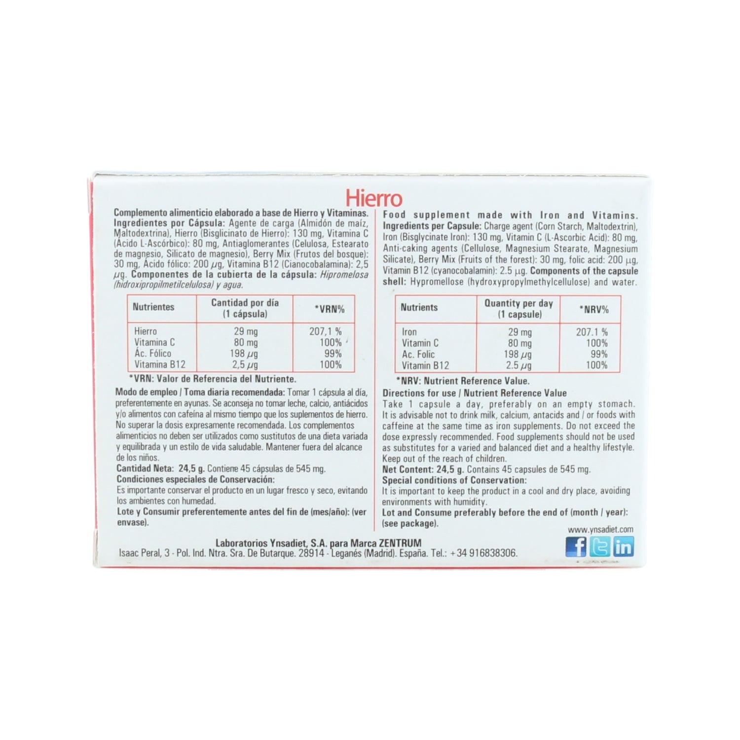 Par capsule : Fer (Bisglycinate de fer) : 130 mg, Vitamine C (Acide L-ascorbique) : 80 mg, Mélange de baies (Baies) : 30 mg, Acide folique : 200 µg, Vitamine B12 (Cyanocobalamine) : 2,5 µg.