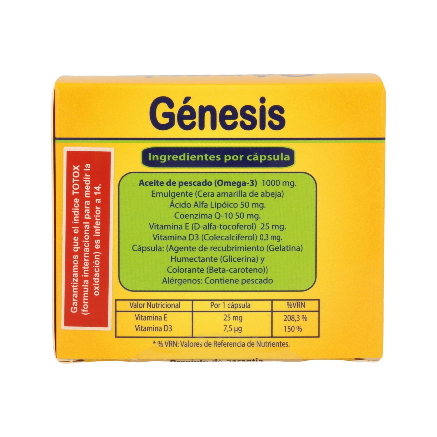 Zeus Génesis DHA 1000 TG 30 Capsules est un complément alimentaire à haute teneur en DHA (minimum 80%) sous forme de triglycérides avec de l'acide alpha-lipoïque, de la coenzyme Q-10, de la vitamine E et de la vitamine D3.