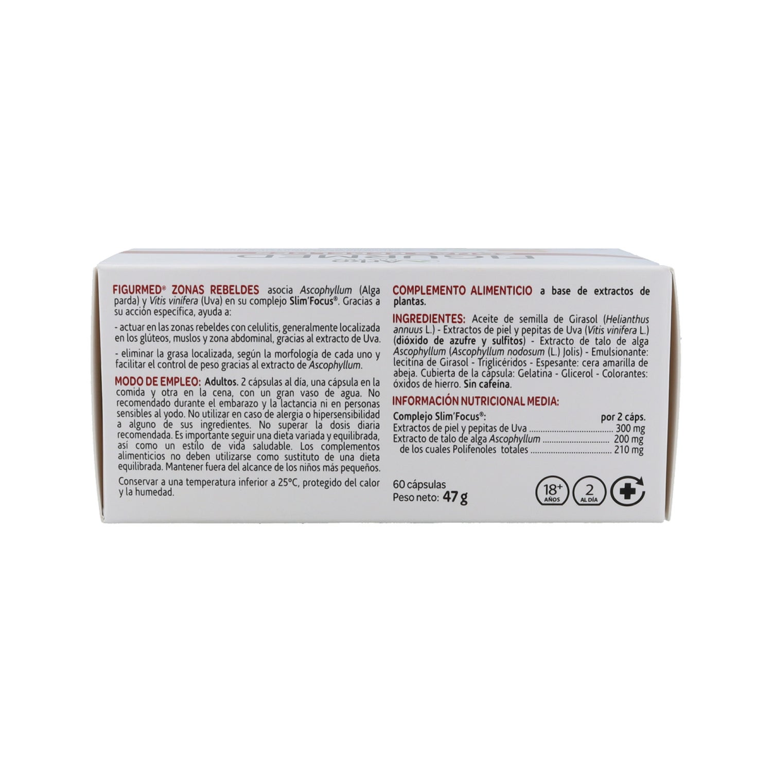 Arkopharma Figurmed Zonas Rebeldes 60caps est un complément alimentaire à base d'extraits de plantes. Grâce à l'extrait de raisin, il permet d'agir sur les zones de cellulite rebelles, généralement situées au niveau des fesses, des cuisses et de la zone abdominale, aide à éliminer les graisses localisées et facilite le contrôle du poids grâce à l'extrait d'ascophylle.